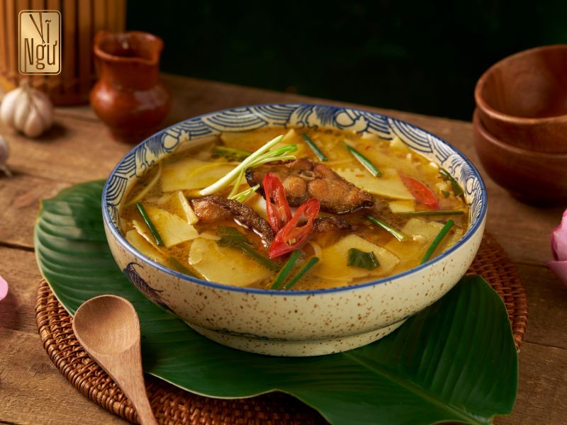 Món đầu đuôi cá lăng om măng là sự kết hợp tuyệt vời giữa vị ngọt tự nhiên của cá lăng và vị chua nhẹ của măng. Cá được om kỹ, thấm đều gia vị, kết hợp với măng giòn giòn, tạo nên một món ăn đậm đà, đưa cơm. Nước om đậm vị, thơm nức mùi hành tạo nên bát canh đưa miệng hơn khi được dùng với cơm trắng.